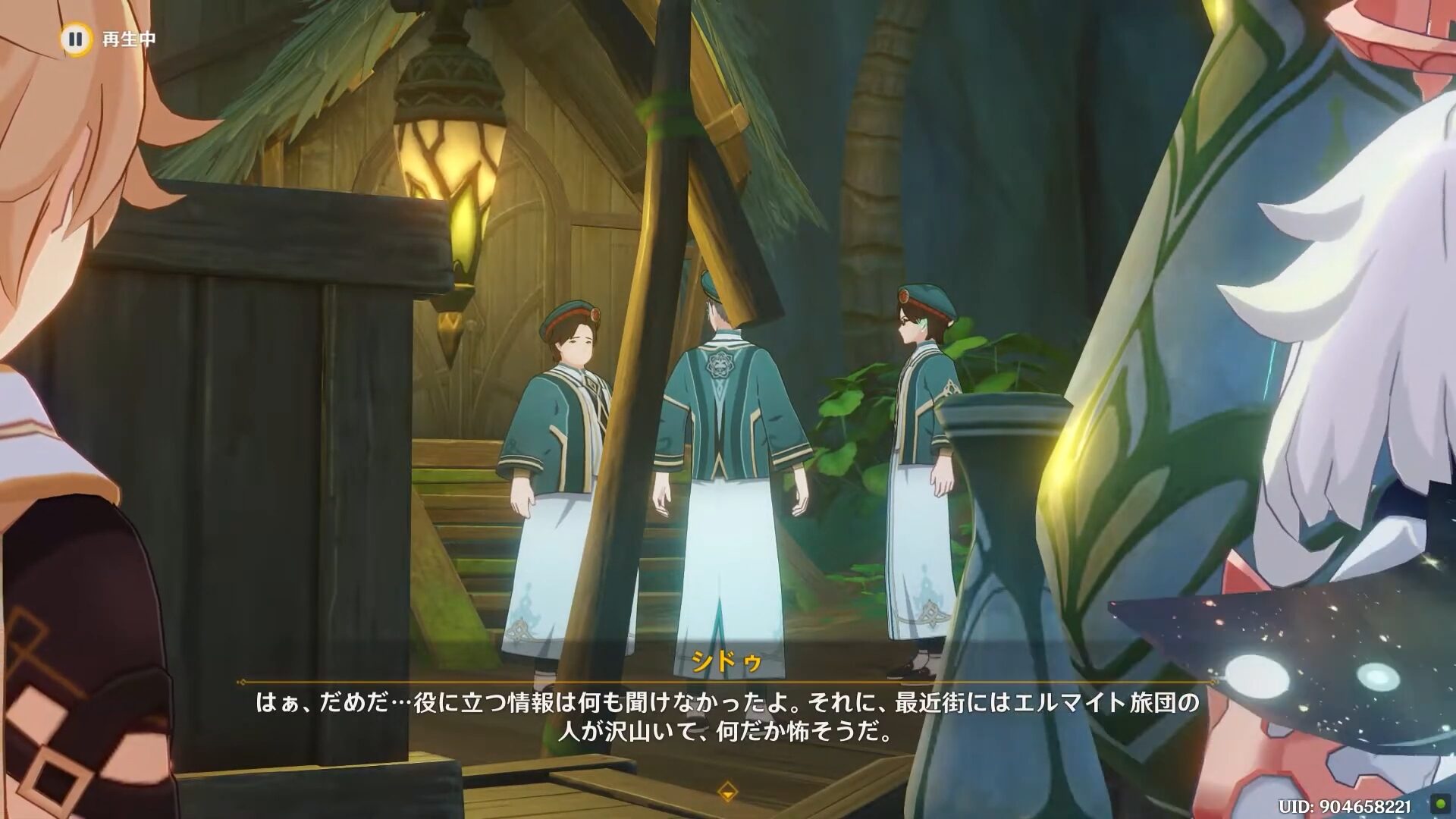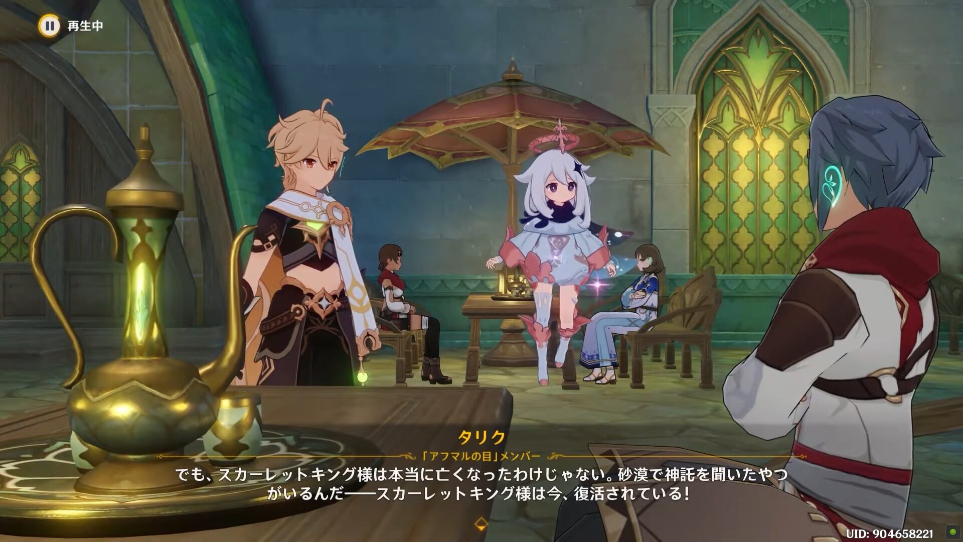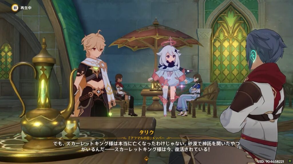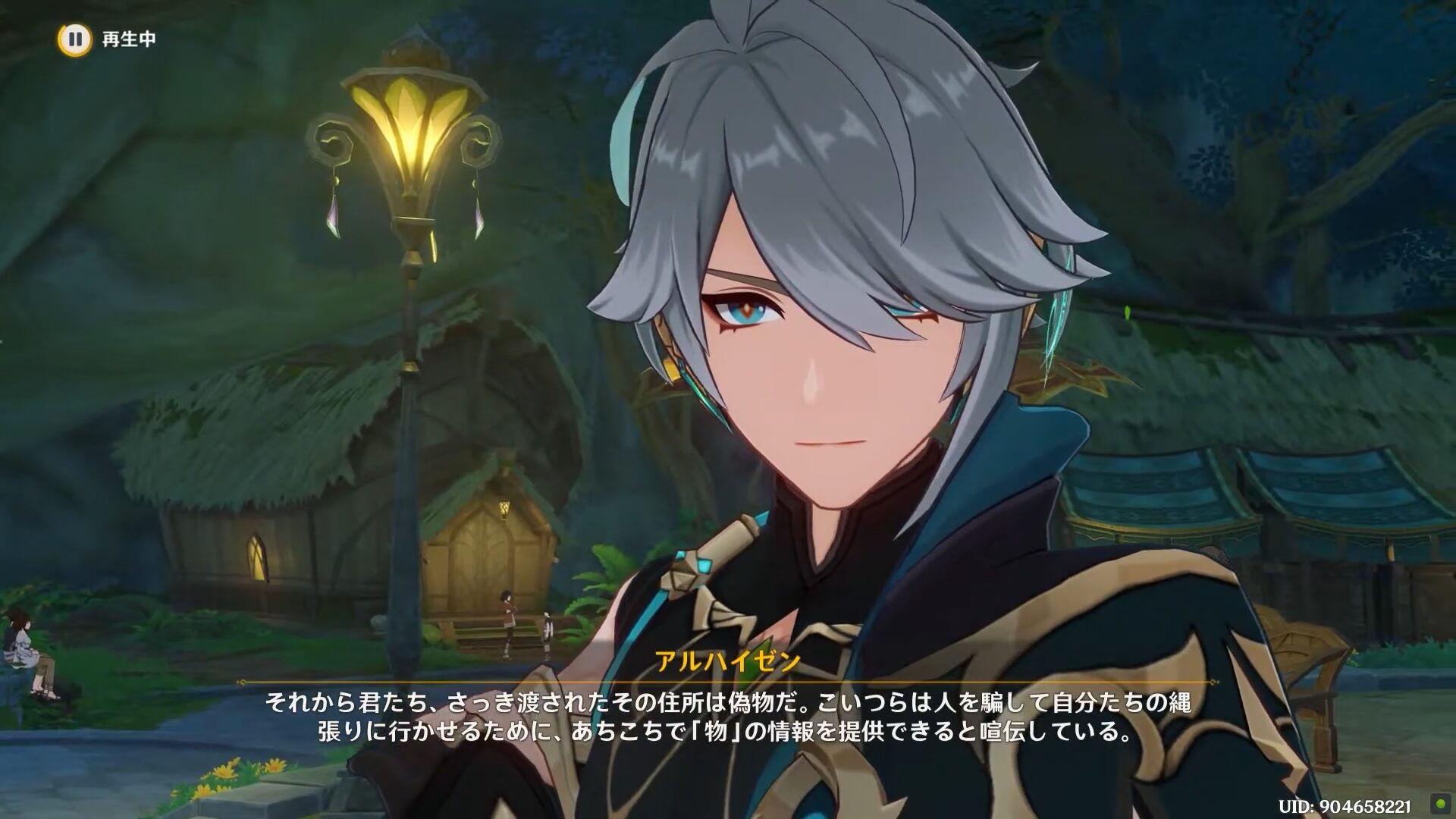 話の途中で、アルハイゼン(CV:梅原裕一郎)が現れ、先程の住所は偽物でそこに行ってしまえば、持ち金を全て渡せと脅されてしまうと割り込んできた。